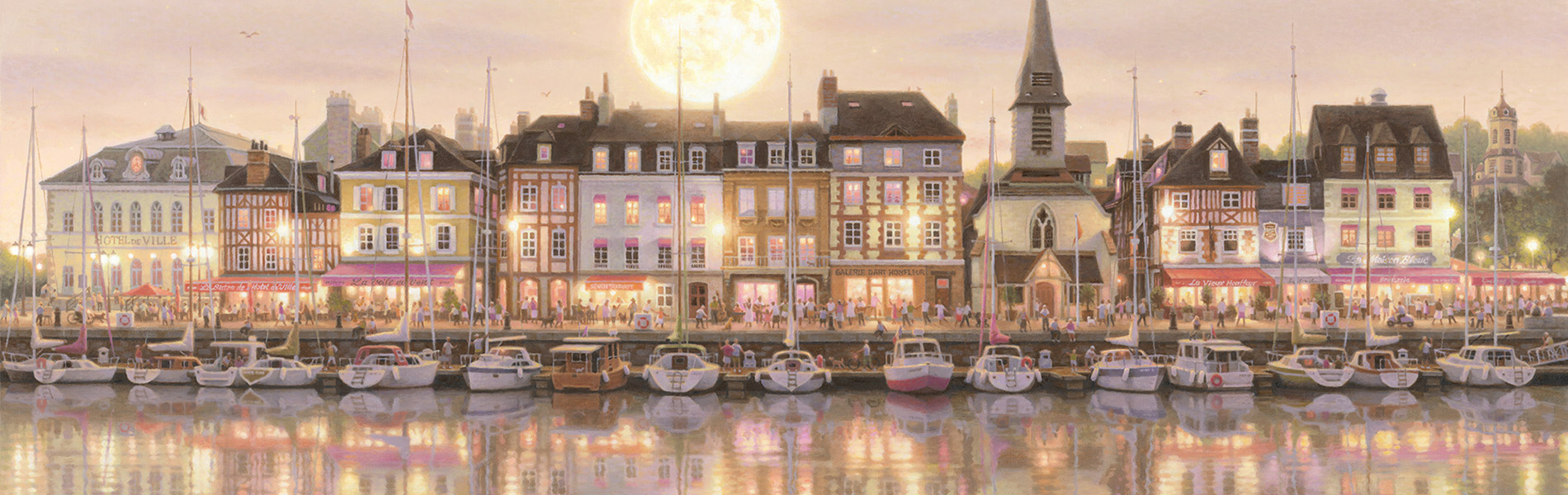 さらっと35年と申し上げましたが、35年・・・、35年です。当たり前なのですが、生まれた赤ちゃんが35歳にもなる年月です。そんなにも長い間、画家として活躍を続けてきたことに、スタッフとしても敬意を抱かずにはいられません。そして笹倉は、今も、精力的に絵を描いており、先だって「画業35周年記念作品」の大作を完成させました。画家として強い思い入れのある街「オンフルール」を描いた作品「印象・オンフルール」です。